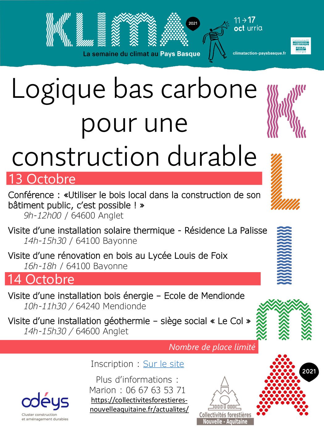 Octobre, 2021 Semaine de Climat avec l'Agglomération du Pays Basque 13oct(oct 13)10h0014(oct 14)16h00Semaine de Climat avec l'Agglomération du Pays Basque1 CONFERENCE ET 4 VISITES sur l'utilisation du bois local dans la construction et la rénovation. Détails de l'événement Inscription ICI Détails de l'événement Inscription ICI Heure13 (Mercredi) 10h00 - 14 (Jeudi) 16h00 CalendrierAjouter à votre Google Agenda